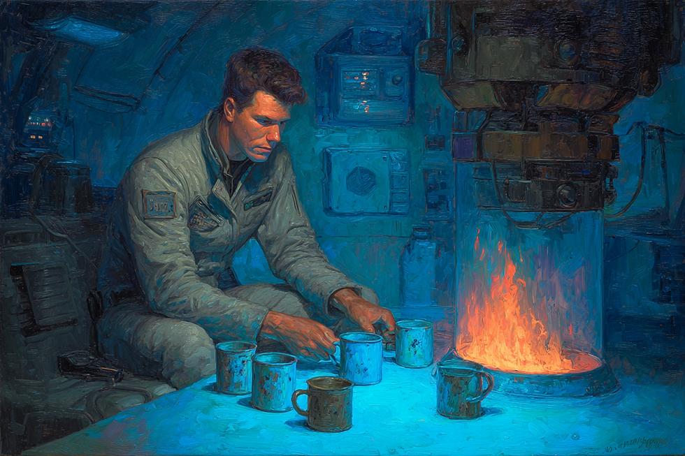 Then he flipped the switch. The holographic fire vanished and overhead lights came on, revealing the bland walls of the rec compartment, SCS Prometheus stenciled on one bulkhead.